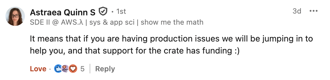 In the last 2 years or so of building with the Rust Lambda runtime and its ecosystem of libraries and tools ( cargo-lambda, we love you!), everything has always felt very stable, reliable and ready for prime time, and it’s great to see that finally AWS thinks so too! This is definitely going to bring more attention and more adoption of this ecosystem, so more people will be reaping the benefits (and the joy) of building Lambda functions using Rust! 🤞