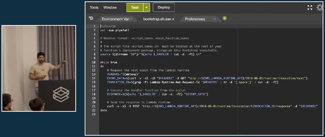A managed runtime is what you get for languages like Python and Node.js, which means you just write the event handler and ship it to the Lambda service and everything else will magically connect. You don’t have to think about updating to the latest patch of Node.js or Python, or how the underlying infrastructure wires your handler code with the event propagation mechanisms that power the Lambda service.